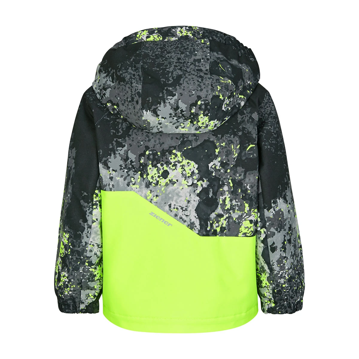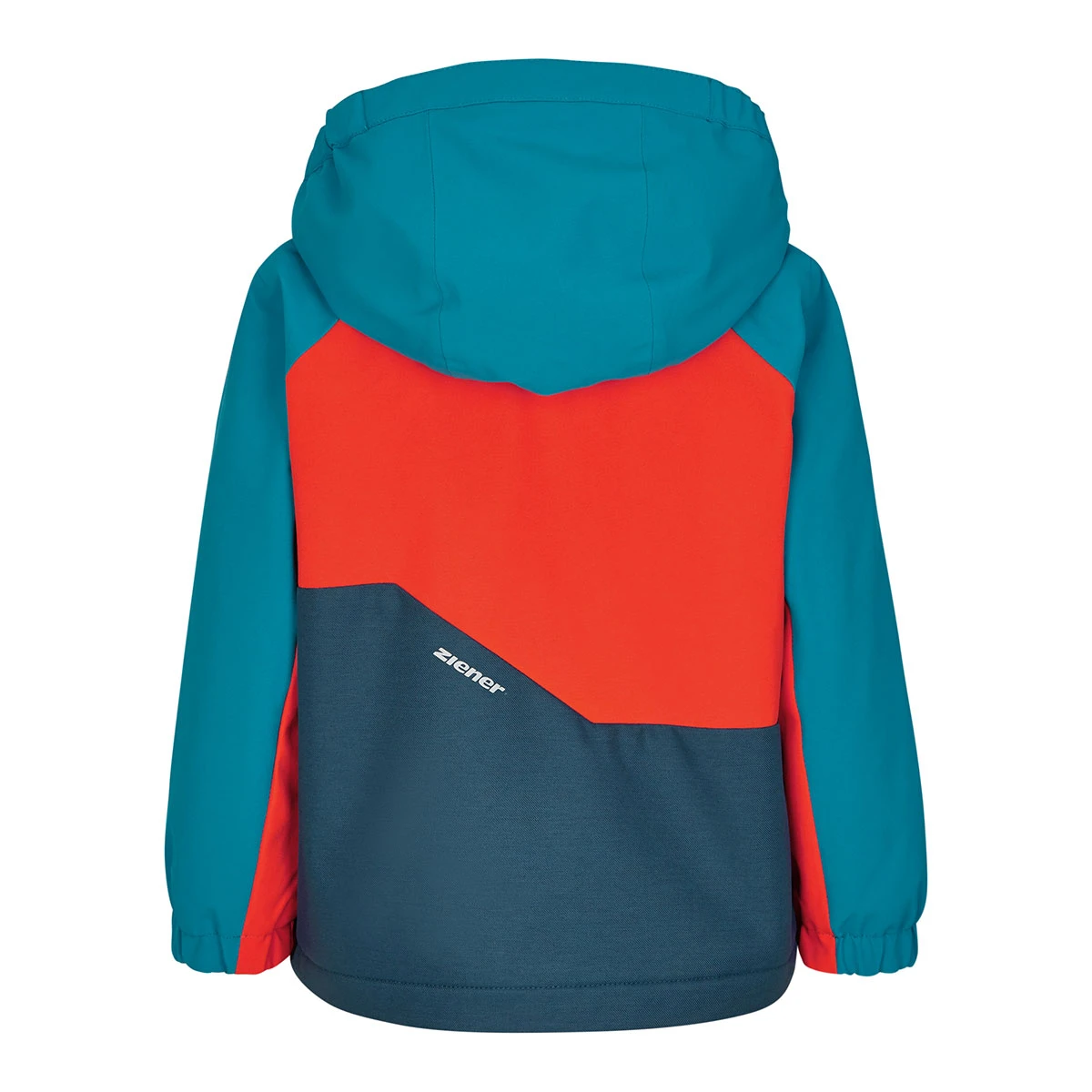Die funktionelle, wattierte ZIENER Schneejacke ANDERL MINI für Kleinkinder hält dank Alpenlandwolle (120g/m² Wattierung) bei kaltem Wetter zuverlässig warm. Zusätzlich ist sie mit der atmungsaktiven, wasser- und winddichten ZIENER AQUASHIELD® Membran (Wassersäule 10.000mm/Atmungsaktivität 10.000g/m²/24h) ausgestattet, die für ein warmes und trockenes Klima sorgt. Wärmendes Futter am Rücken sorgt für zusätzliche Isolierung und weiche, elastische Bündchen am Ärmelende garantieren einen perfekten Sitz. Die Jacke punktet mit weiteren Details wie verschweißte Nähte, einer Befestigungsmöglichkeit für Handschuhe und reflektierenden Designelementen. Dank der umweltfreundlichen Imprägnierung ist sie PFC frei. Die Kapuze entspricht der Norm DIN EN 14682 für Sicherheit von Kinderbekleidung. Besonders an den Produkten der MINI-Kollektion ist die extrem weiche Haptik bei gleichzeitig hoher Robustheit – perfekt, um stundenlang im Schnee herumzutollen.