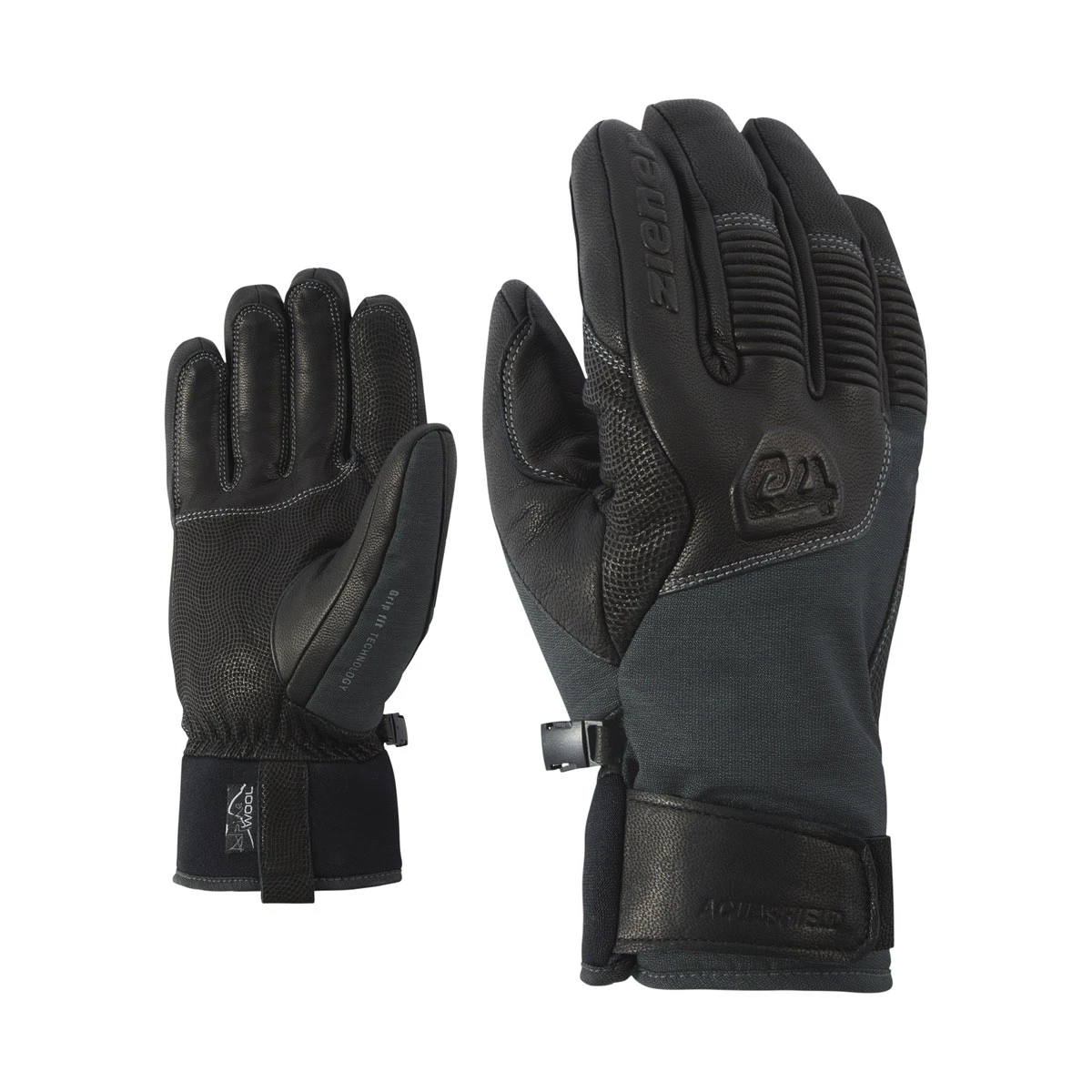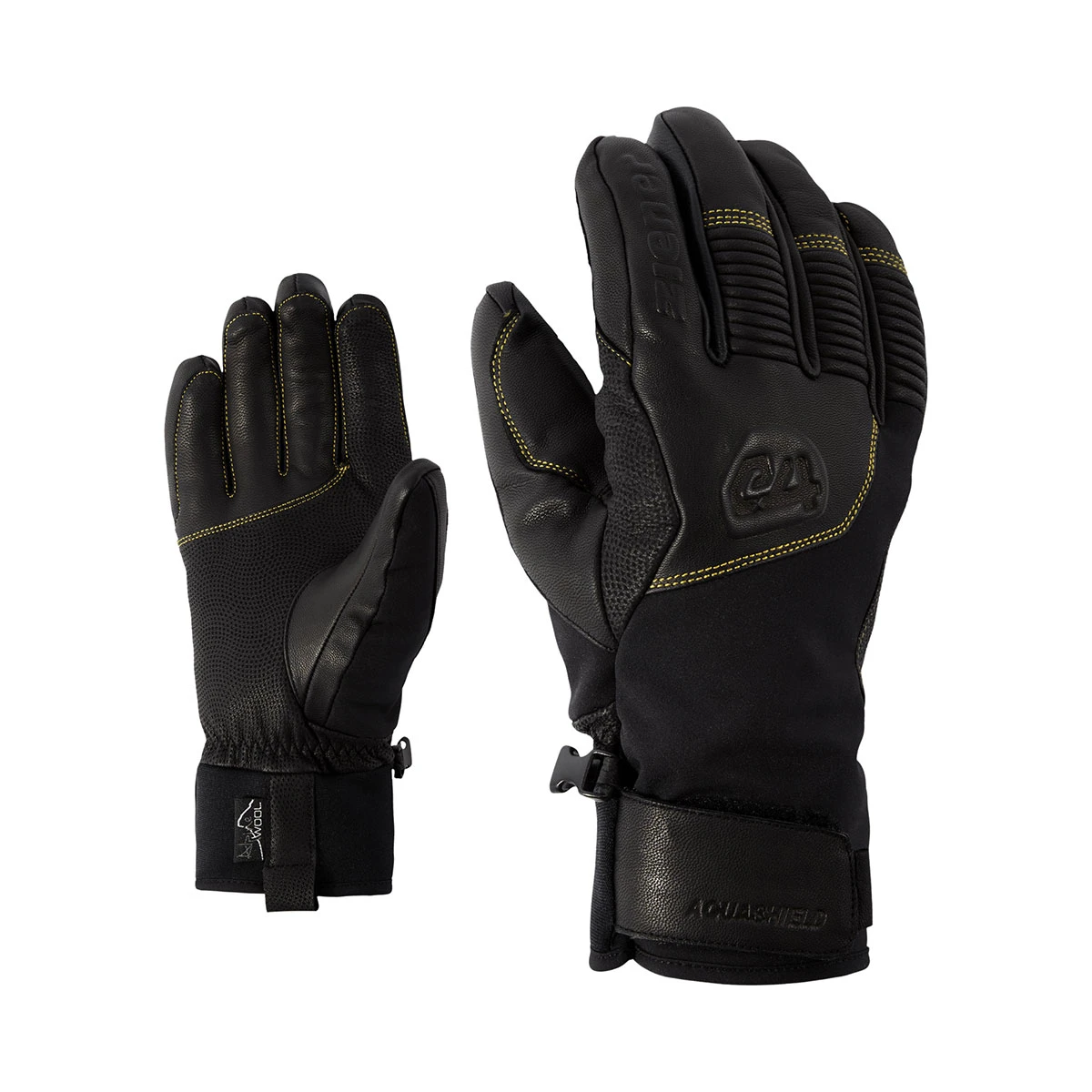Die freeride-orientierten, sehr warmen ZIENER Herrenskihandschuhe GANZENBERG AS® AW sind ausgestattet mit der wasser- und winddichten ZIENER AQUASHIELD® Membran. Die Wattierung mit besonders warmer und weicher lavalan® Alpenlandwolle hält die Körpertemperatur im Wohlfühlbereich und sorgt für ein angenehmes Tragegefühl. Die taktile und verstärkte Innenhand aus Ziegenleder ist sehr robust und garantiert optimales Griffgefühl am Skistock. Das Neoprenbündchen mit Klettverschluss am Handgelenk schließt sehr gut ab und sorgt für optimale Passform. Die breite Leash fixiert den Handschuh zusätzlich am Handgelenk. Das Produkt enthält recyceltes Material – für einen ressourcenschonenden Umgang mit der Umwelt. Enthält nichttextile Teile tierischen Ursprungs.