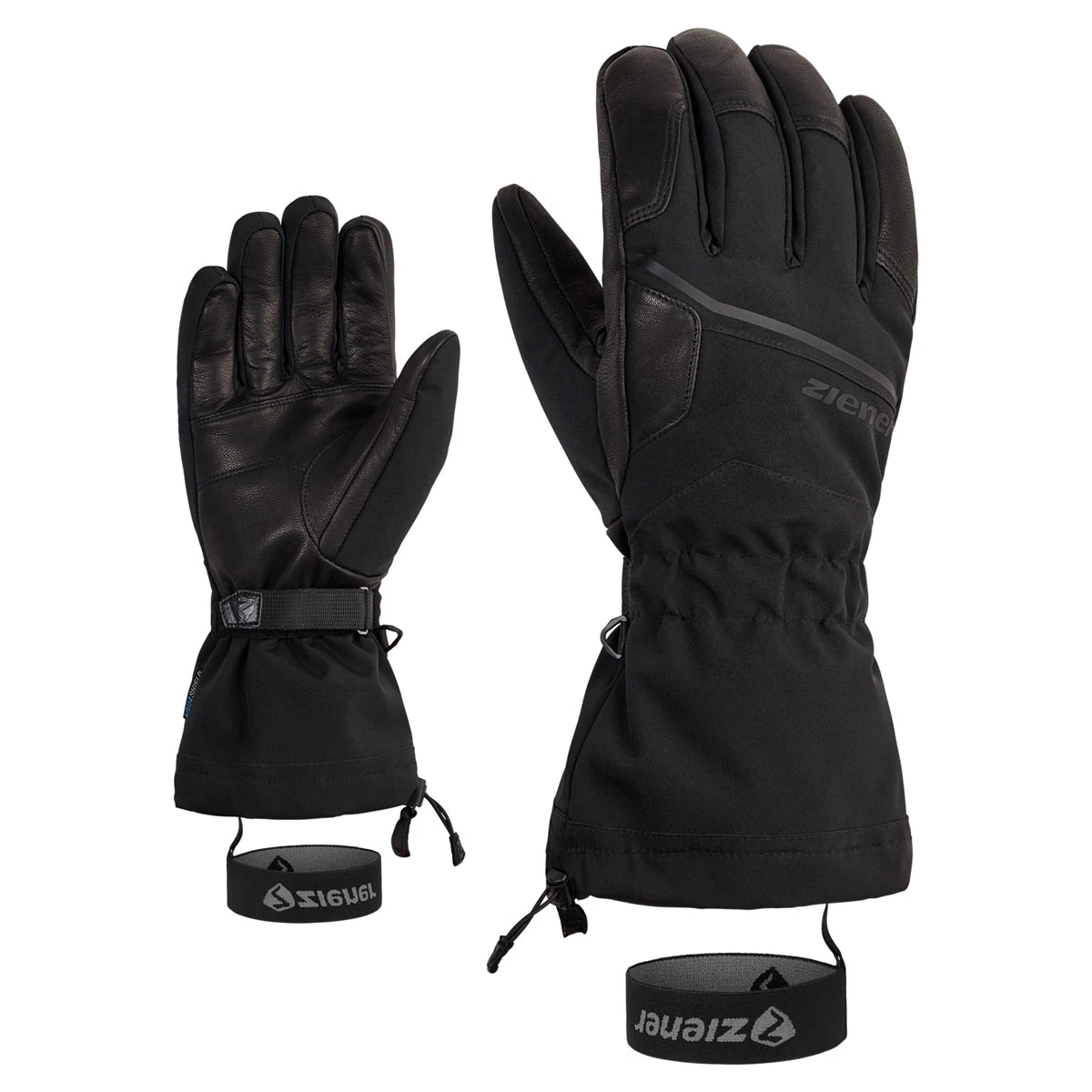 Die modernen, sportlichen ZIENER Herrenskihandschuhe GARNI AS® AW mit der wasser- und winddichten ZIENER AQUASHIELD® Membran halten auch bei widrigem Wetter angenehm trocken. Die warme Wattierung mit bequemer lavalan® Alpenlandwolle hält die Körpertemperatur auch an kalten Tagen im Wohlfühlbereich und garantiert optimalen Klimakomfort. Eine robuste, griffige und weiche Innenhand aus Ziegenleder bietet eine optimale Kraftübertragung und Griffgefühl am Skistock. Der Handschuh wird mit Hilfe eines Gurtbands fixiert und die lange Stulpe kann dank Cordlock-System mit nur einer Hand fest gezogen werden. Die praktische Leash fixiert die Handschuhe zusätzlich. Das Produkt enthält recyceltes Material – für einen ressourcenschonenden Umgang mit der Umwelt. Enthält nichttextile Teile tierischen Ursprungs.