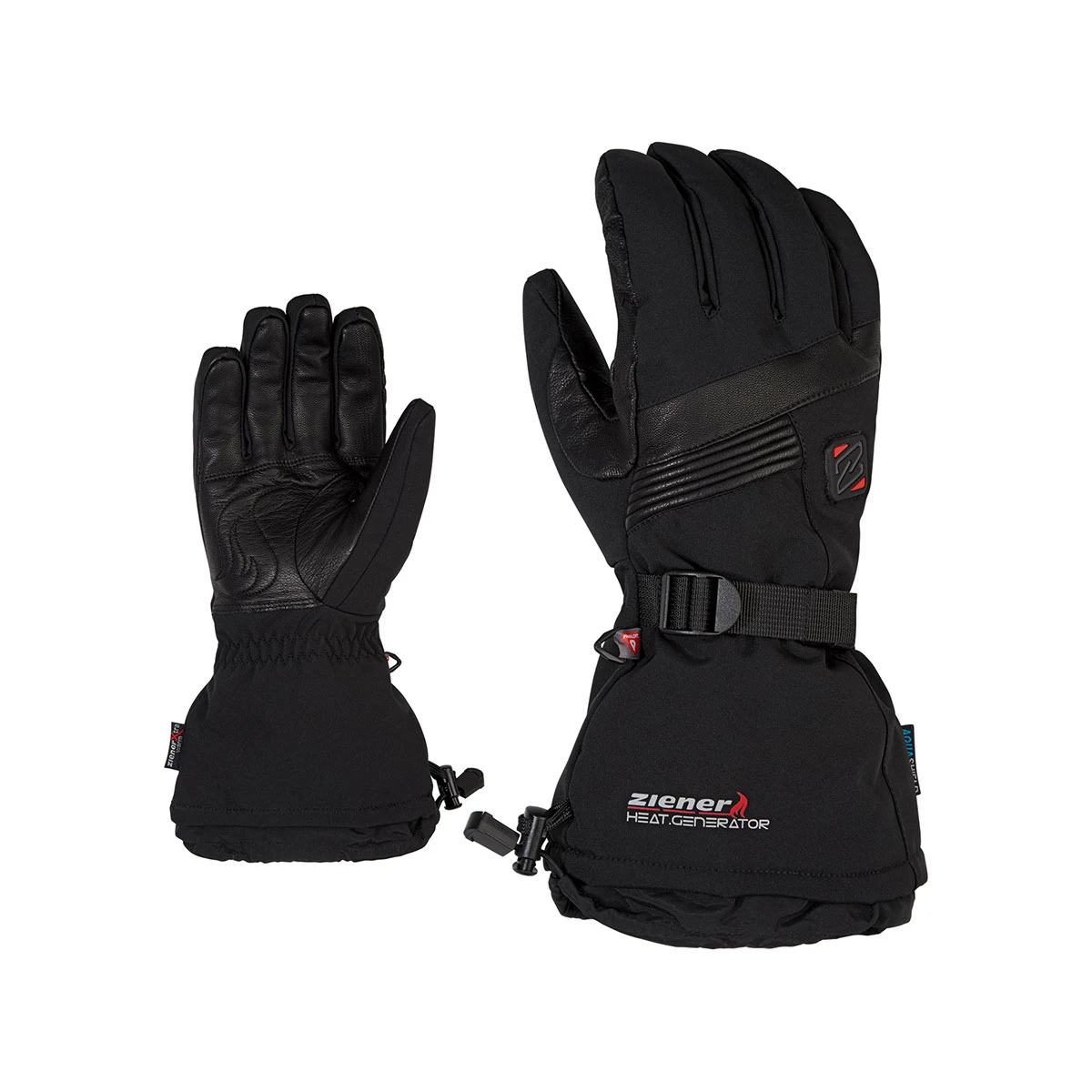 Die innovativen, beheizbaren ZIENER Skihandschuhe GERMO AS® PR HOT mit einer weichen, robusten Innenhand aus Ziegenleder sind ausgestattet mit der wasser- und winddichten ZIENER AQUASHIELD® Membran. Die Heizfunktion erfolgt über einen kleinen Akku, der sicher und komfortabel in einer Tasche auf der Innenseite der Handschuhstulpe verstaut werden kann. Die Komfortzone von 37-40 Grad im Handschuh wird je nach Außentemperatur durch drei verschiedene Heizstufen erreicht. Somit ist eine optimale Wärmeregulierung garantiert. Eine zusätzliche, besonders warme PrimaLoft® Gold Wattierung hält die Hände auch bei niedriger Stufe bis zu 8 Stunden angenehm warm. Bei höchster Stufe heizt der Akku dem Skifahrer bis zu 4 Stunden ein. Die lange Stulpe wird mit Hilfe einer Leiterschnalle fixiert und kann dank Cordlock-System mit nur einer Hand fest ans Handgelenk gezogen werden. Das Produkt enthält recyceltes Material – für einen ressourcenschonenden Umgang mit der Umwelt. Enthält nichttextile Teile tierischen Ursprungs.