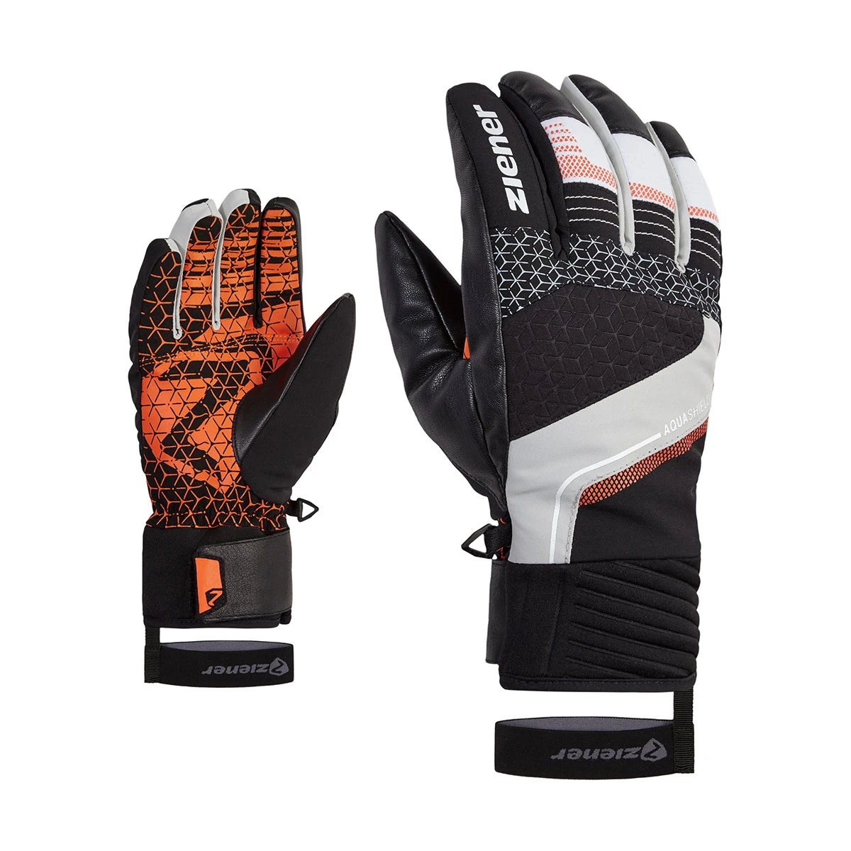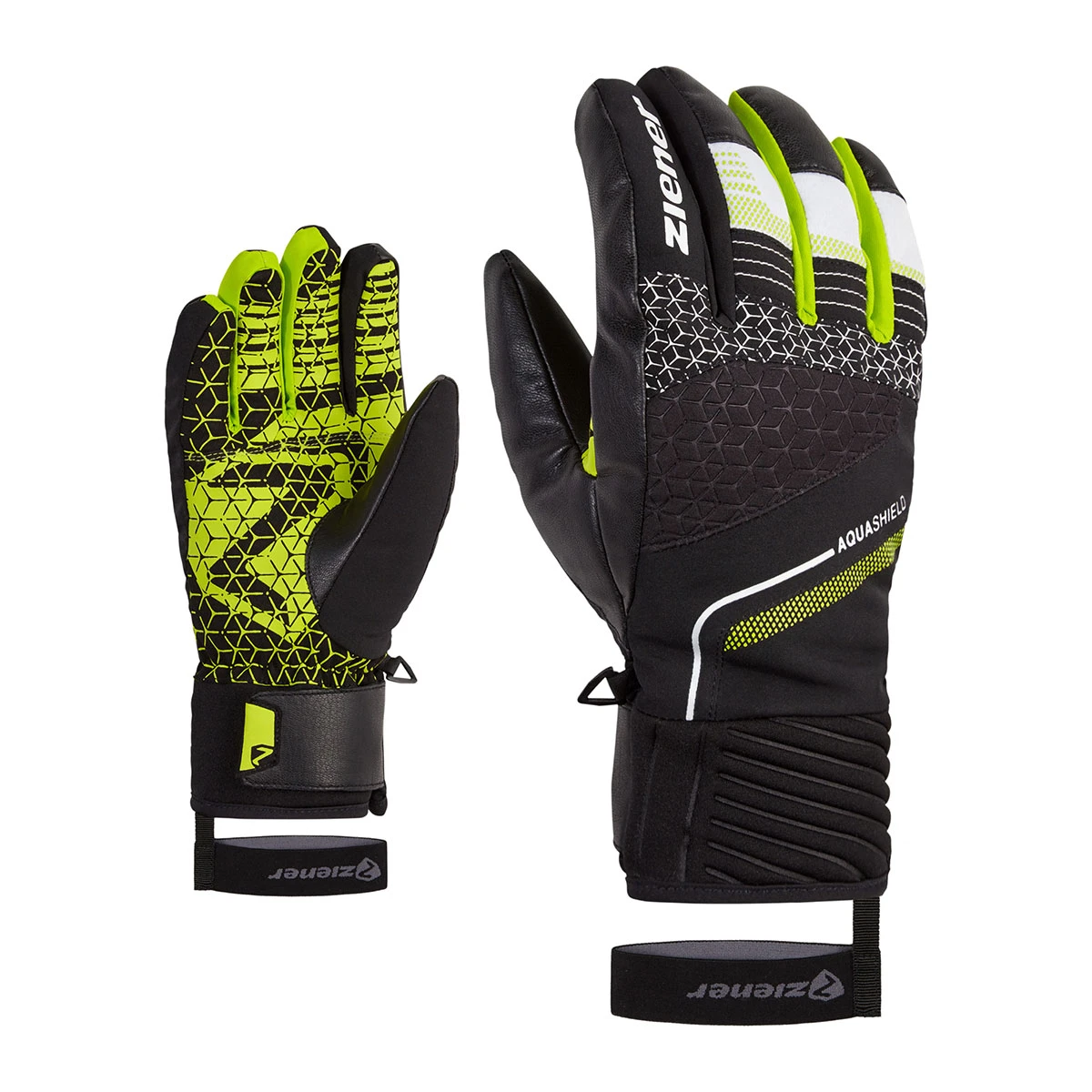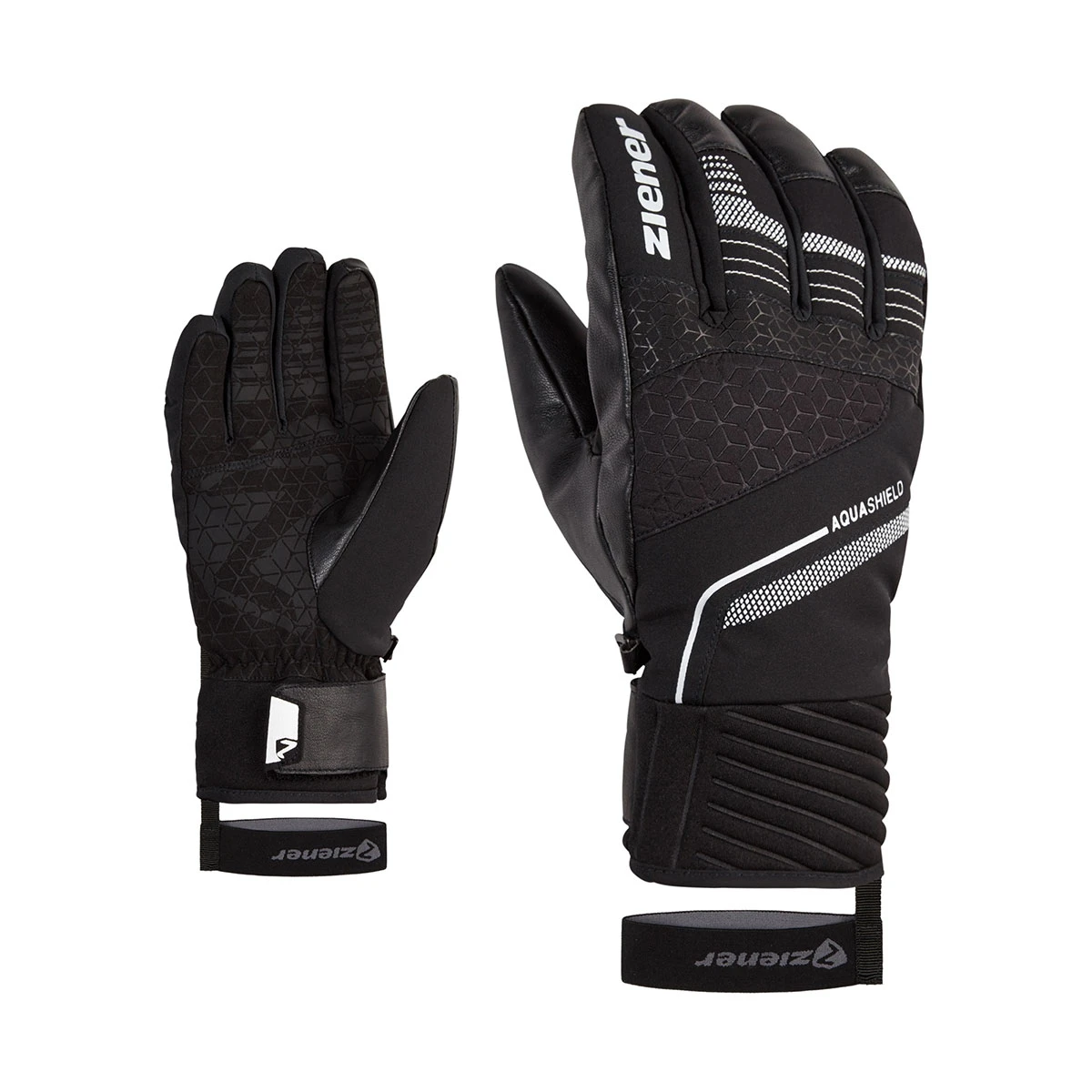 Die sportiven, modernen ZIENER Herren Skihandschuhe GONZALO AS® sind mit einer verstärkten und bedruckten Innenhand aus AMARA-Material sowie mit der GRIP FIT Technologie ausgestattet – für das perfekte Griffgefühl am Skistock. Die wasser- und winddichte ZIENER AQUASHIELD® Membran sorgt für ein trockenes Klima im Handschuh – auch bei widrigen Wetterbedingungen. Das hochwertige Material ist atmungsaktiv und elastisch, wodurch höchster Wohlfühlkomfort gegeben ist. Das enganliegende Neoprenbündchen ermöglicht ein Abschließen unter dem Jackenärmel. Mit Hilfe der breiten Leash können die Handschuhe zusätzlich fixiert werden.