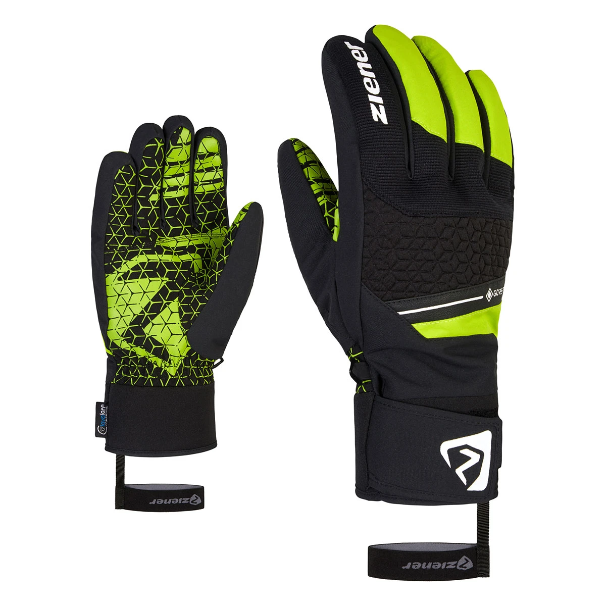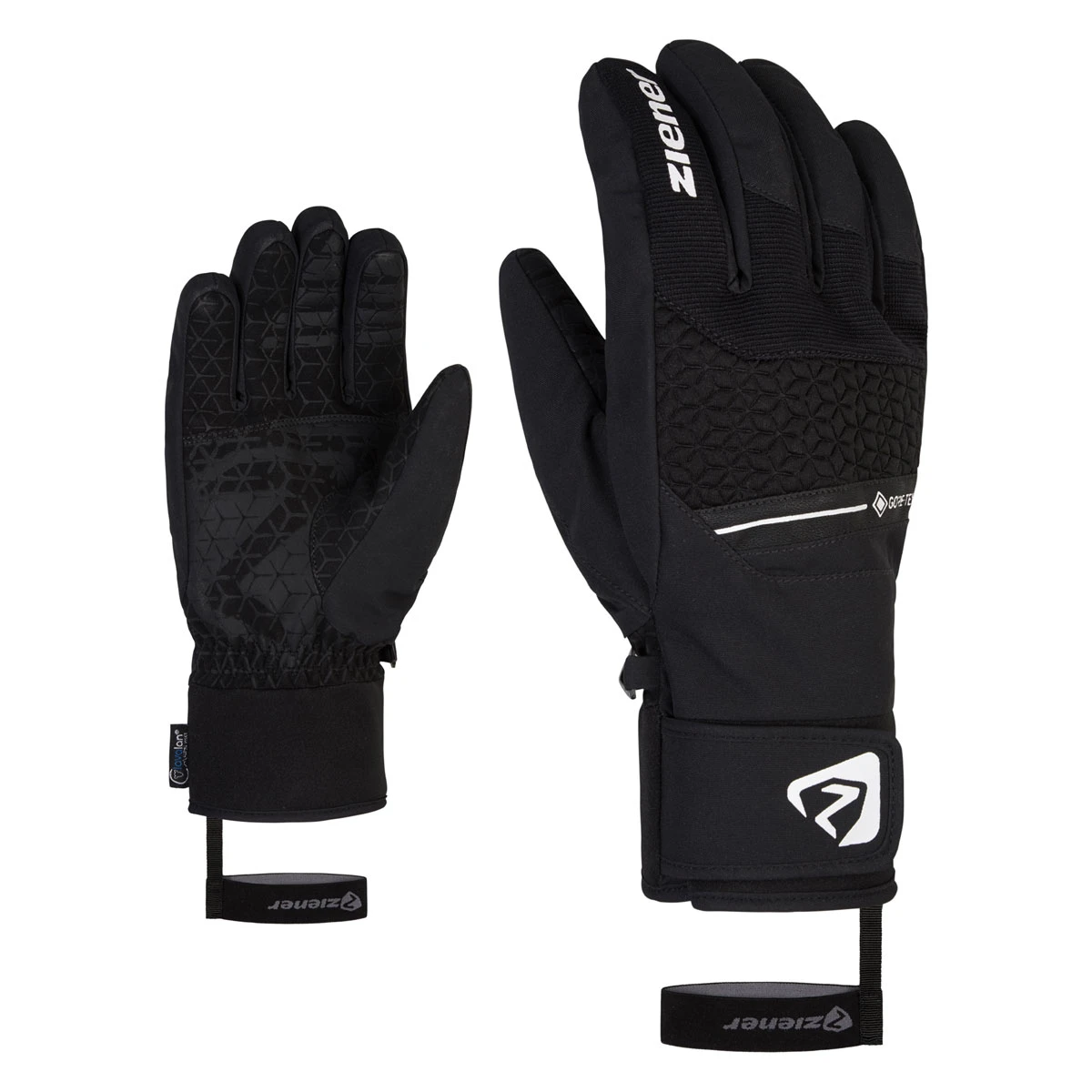 Die jungen, modernen ZIENER Herrenskihandschuhe GRANIT GTX AW sind ausgestattet mit einer GORE-TEX Membran und dadurch dauerhaft wasserdicht, winddicht und atmungsaktiv. Die Wattierung mit besonders warmer und weicher lavalan® Alpenlandwolle hält die Körpertemperatur stets im Wohlfühlbereich und sorgt für angenehmes, wohliges Tragegefühl. Die bedruckte, rutschfeste Innenhand aus strapazierfähigem, lederähnlichem Material mit atmungsaktiven Eigenschaften sorgt für optimales Griffgefühl am Skistock. Die Stulpe mit Klettverschluss ermöglicht es die Handschuhe unter der Jacke zu tragen. Die breite Leash fixiert den Handschuh auch bei schnellem Ausziehen zuverlässig am Handgelenk. Enthält nichttextile Teile tierischen Ursprungs.