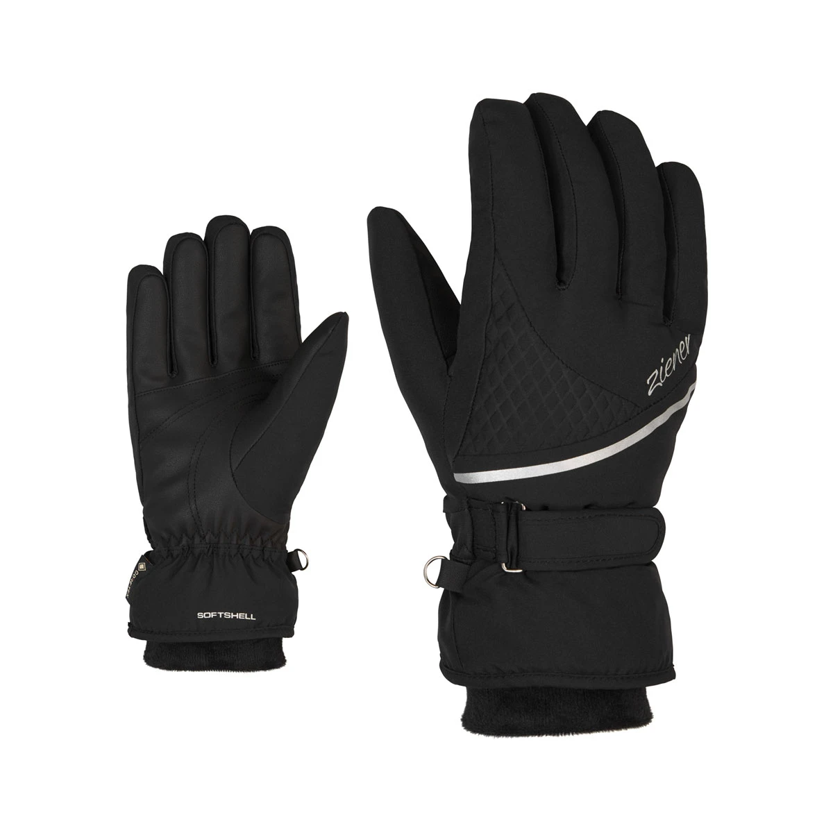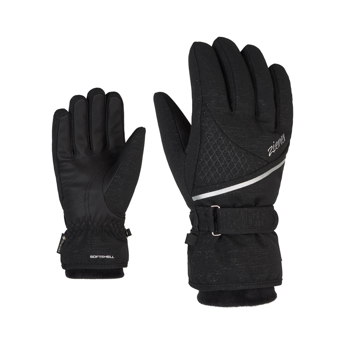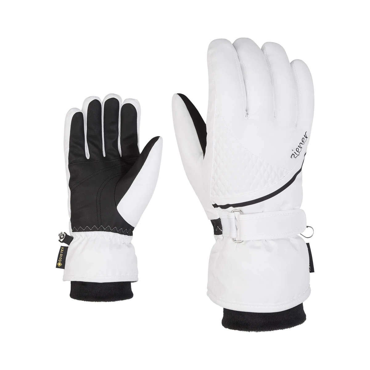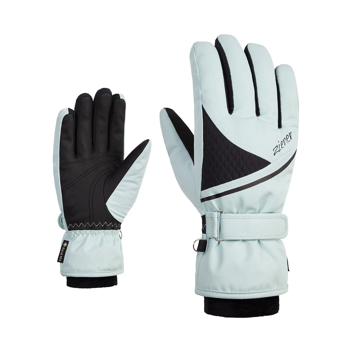 Die eleganten, warmen ZIENER Damenskihandschuhe KIANA GTX + Gore plus warm LADY sind ausgestattet mit der GORE-TEX Membran mit Gore plus warm Technologie und dadurch dauerhaft wasserdicht, winddicht, atmungsaktiv und extra warm – garantiert! Das wärmende Plüschfutter am Bündchen und die weiche Wattierung halten die Hände auch an kalten Tagen angenehm warm und sorgen für einen femininen Look auf der Skipiste. Dieser wird durch trendige Oberhandmaterialien aus Melange- oder Twillstoff vervollständigt. Der Riegelverschluss fixiert die Handschuhe – für den perfekten Sitz am Handgelenk.