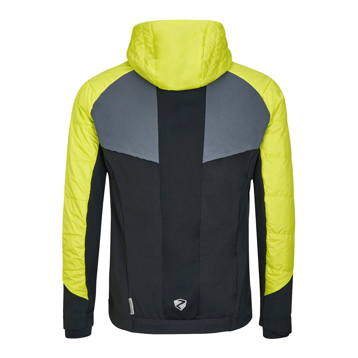 Die funktionelle ZIENER Herren Woll-Hybrid Jacke NAKOS MAN spendet dank der lavalan® Woll-Wattierung (60g/m² Wattierung) und dem Stormfleece® mit Wolle extra Wärme. Die feste Kapuze mit hohem Kragen trägt zu einem hohen Funktionskomfort bei, während der Einsatz des atmungsaktiven und winddichten ZIENER WINDSHIELD® Materials im oberen Jackenbereich zusätzlich das Auskühlen durch den Wind verhindert. Das elastische Obermaterial schenkt viel Bewegungsfreiheit. Und wenn man ins Schwitzen kommen sollte, sorgen die Ventilationsöffnungen am Rücken für ein angenehmes Klima. Dank der umweltfreundlichen Imprägnierung ist die Jacke PFC frei. Zwei Eingrifftaschen mit Reißverschluss garantieren sicheren Stauraum für kleine Gegenstände. Die Jacke ist zudem mit reflektierenden Designelementen versehen.
