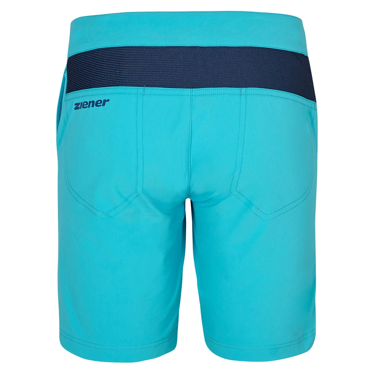 Die funktionelle, elastische ZIENER Kinder Shorts NATSU JUNIOR ist dank des 4-Wege-Stretch-Materials und einem eingesetzten elastischen Einsatz hinten extrem flexibel und passt sich allen Bewegungen perfekt an. Der Bund ist ebenfalls weitenregulierbar. Die Shorts verfügt über zwei Eingrifftaschen und eine Reißverschlusstasche – somit ist genügend Stauraum vorhanden.