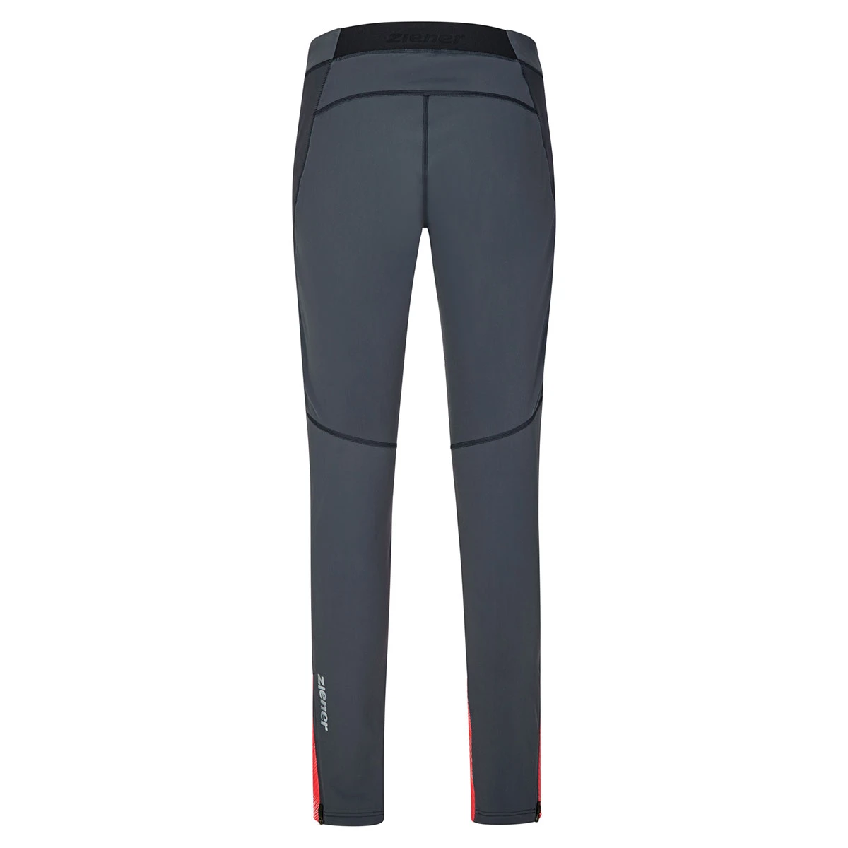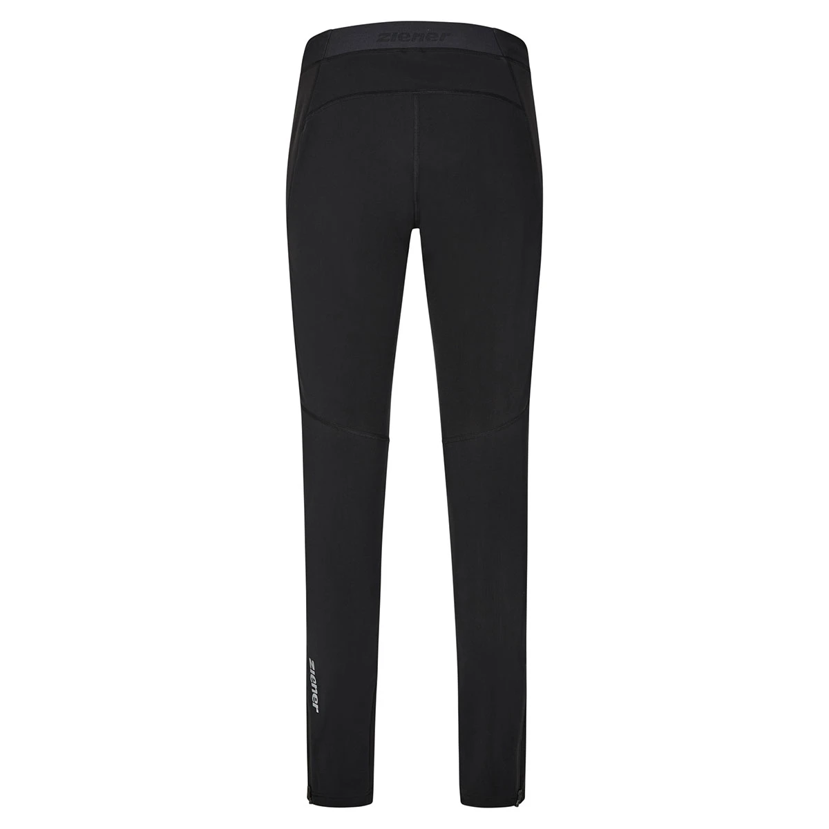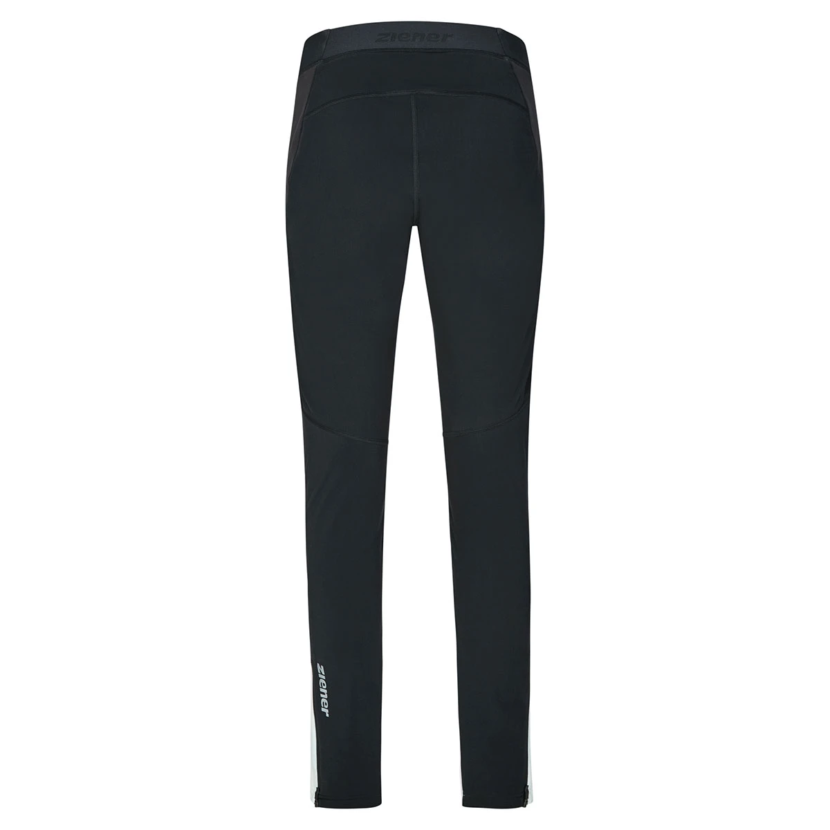 Die funktionelle ZIENER Damen Tights NURA LADY mit SLIM FIT Passform eignet sich perfekt zum Langlaufen. Sie besteht aus einem intelligenten Materialmix aus winddichtem Softshell-Material auf der Vorderseite (ZIENER WINDSHIELD®) und einer elastischen Rückseite aus 4-Wege Stretch-Material – für maximale Bewegungsfreiheit und hohen Tragekomfort. Dank der umweltfreundlichen Imprägnierung ist die Hose PFC frei. Der Reißverschluss am Beinende sorgt für einen optimalen Abschluss der Hose über dem Schuh. Der bequeme Bund wird mit einer Kordel reguliert. Die Tights ist mit einer Reißverschlusstasche vorne ausgerüstet – perfekt zum Verstauen von kleinen Gegenständen. Die Hose ist mit reflektierenden Designelementen versehen. Made in Europe.