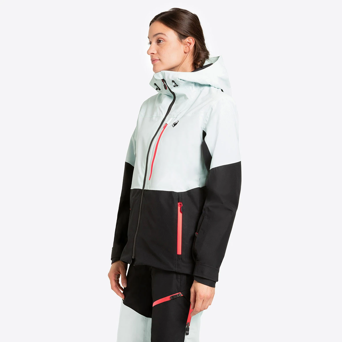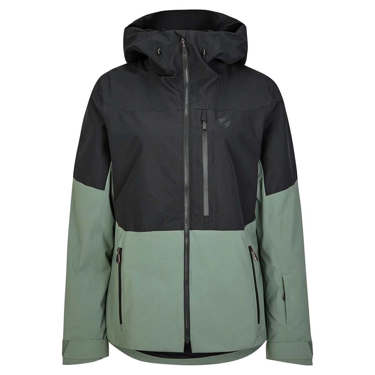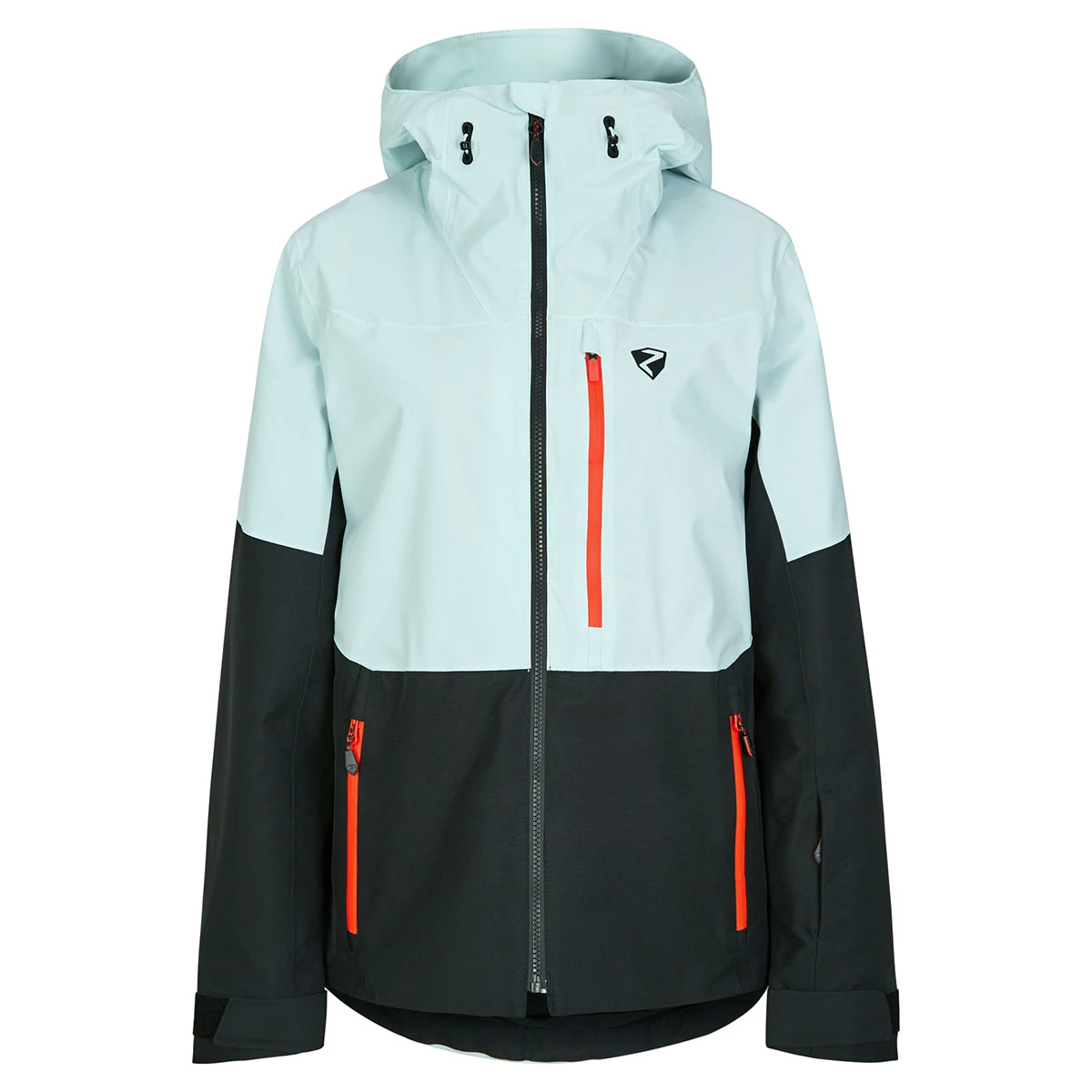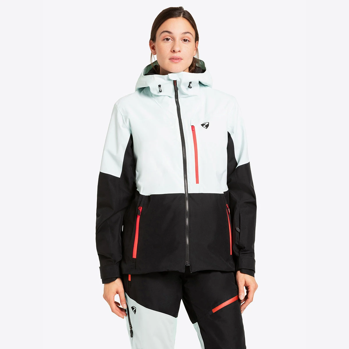 Die hochfunktionelle, unwattierte ZIENER Damen Skijacke TURIS LADY punktet mit recycelten Materialien. Die atmungsaktive, wasser- und winddichte sowie nachhaltige SYMPATEX® Membran (Wassersäule 20.000mm/Atmungsaktivität 15.000g/m²/24h) und das PONTETORTO Futter mit natürlicher Wolle sorgen für ein angenehmes, trockenes Klima und ein perfektes Wärmegleichgewicht. Dank der umweltfreundlichen Imprägnierung ist die Jacke PFC frei. Das Besondere: die Jacke und die Skihose der Freeride Kollektion können mit Hilfe eines Reißverschlusses zu einem Einteiler verbunden werden. Dies verhindert das Verrutschen der Jacke und das Eindringen von Schnee und Kälte. Technische Details wie die verstellbare Funktionskapuze, elastische Ärmelinnenbündchen und ein weitenregulierbarer Saum sorgen für einen perfekten Funktionskomfort. Ein extra hoher Kragen hält den Hals an kalten Tagen schön warm. Wasserdichte Reißverschlüsse und ein abnehmbarer Schneefang gehören zur Basisausstattung. In den beiden Eingrifftaschen und der Brusttasche lassen sich die wichtigsten Dinge dank Reißverschluss sicher verstauen. Die seitliche Skipasstasche, Taschen für Ski- und Sonnenbrillen sowie eine Smartphone Tasche machen die Jacke zu einem unverzichtbaren Begleiter auf der Piste. Und sollte es doch mal zu warm werden, sorgen die Belüftungsmöglichkeiten unter den Armen für die nötige Ventilation. Die wichtigsten Nähte sind verschweißt. Das Produkt enthält recyceltes Material – für einen ressourcenschonenden Umgang mit der Umwelt.